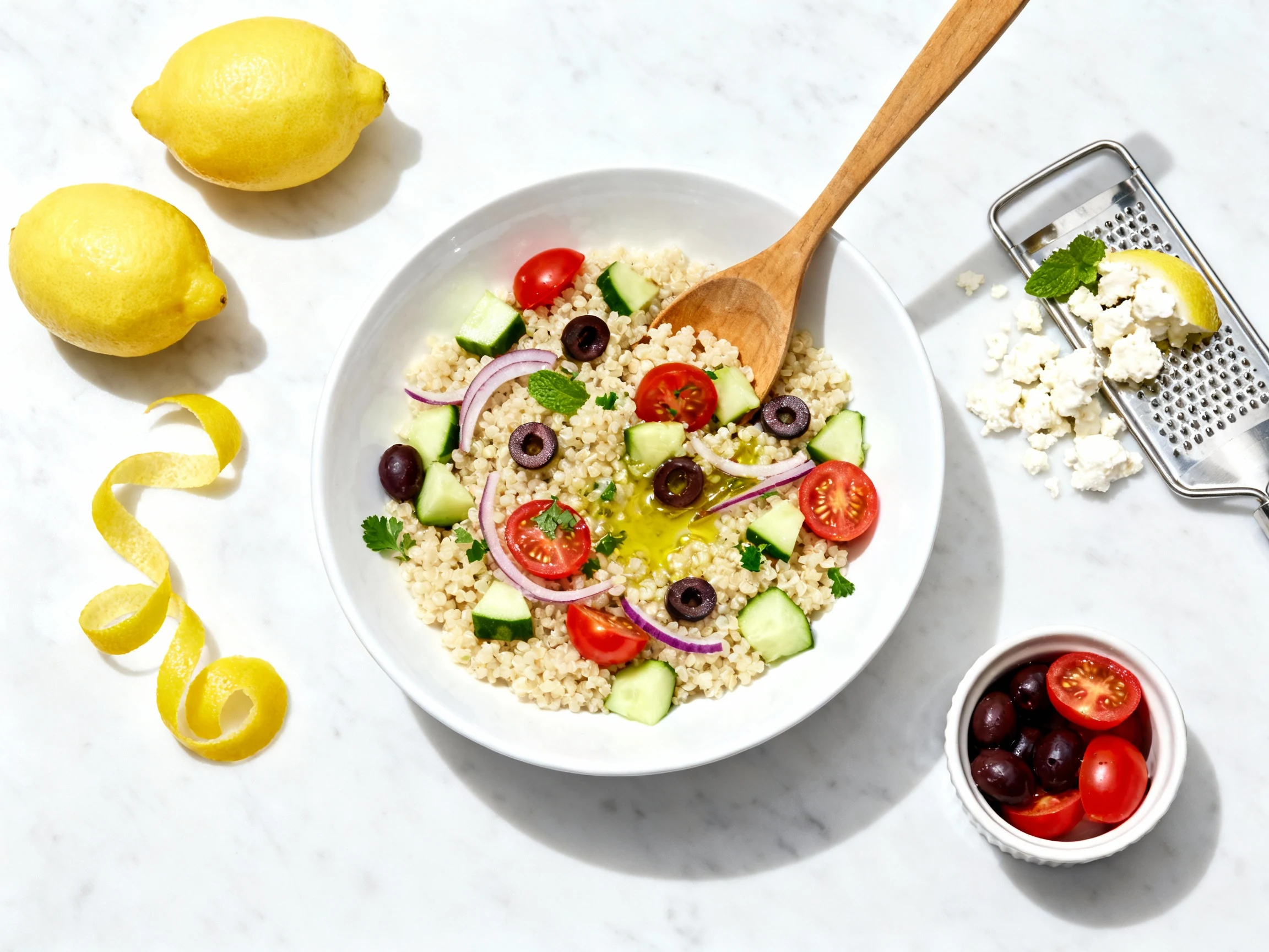 Weeknight-friendly, high-protein Greek quinoa tossed with zesty lemon-kissed feta and crisp veggies—fast, fresh, and done in just 15 minutes.