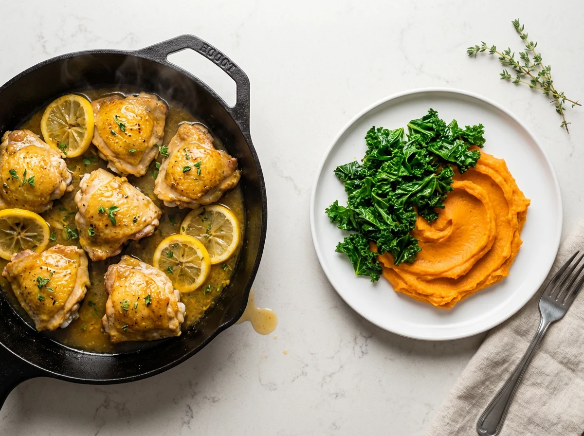 - Plate it: Spoon sweet potato mash onto plates, top with chicken, and ladle the lemony pan sauce over. Add garlicky kale on the side. Garnish with parsley and lemon wedges if you’re feeling extra.