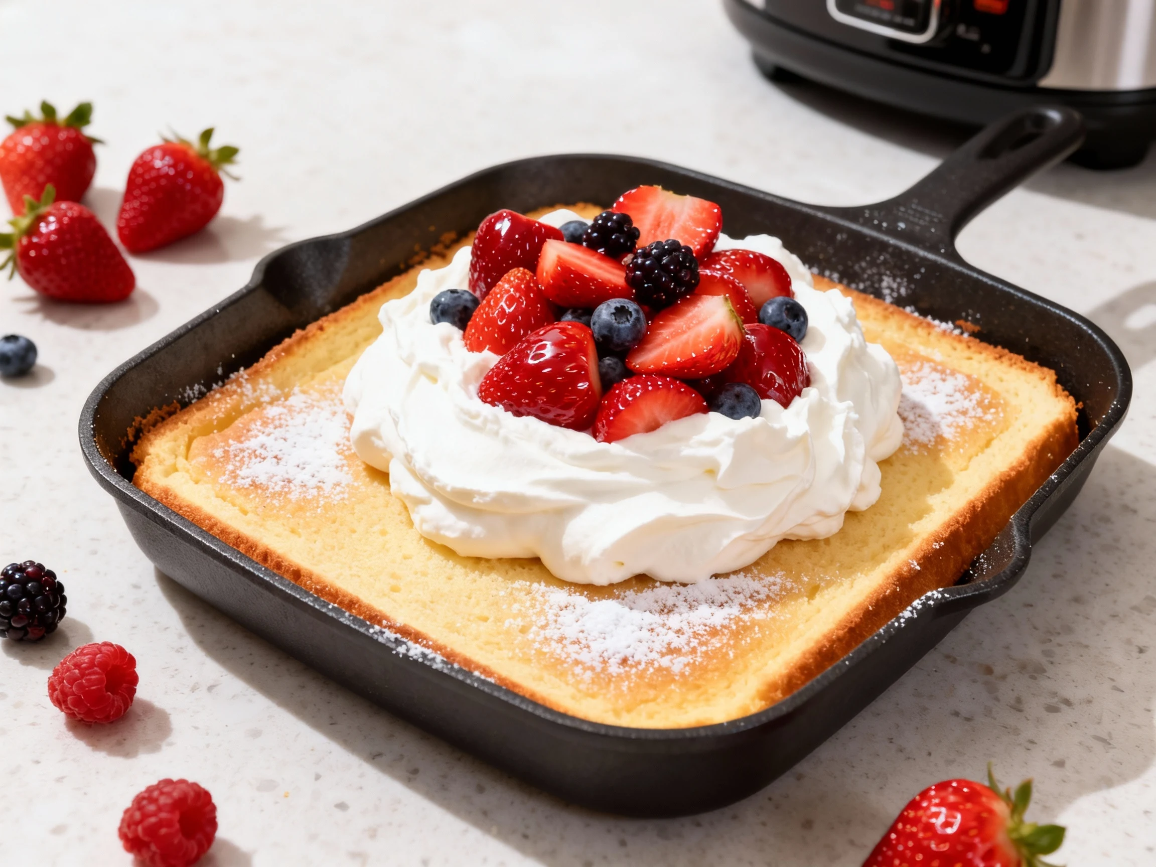 A quick, crowd-pleasing berry shortcake cake that bakes in an air fryer pan, then gets piled high with whipped cream.