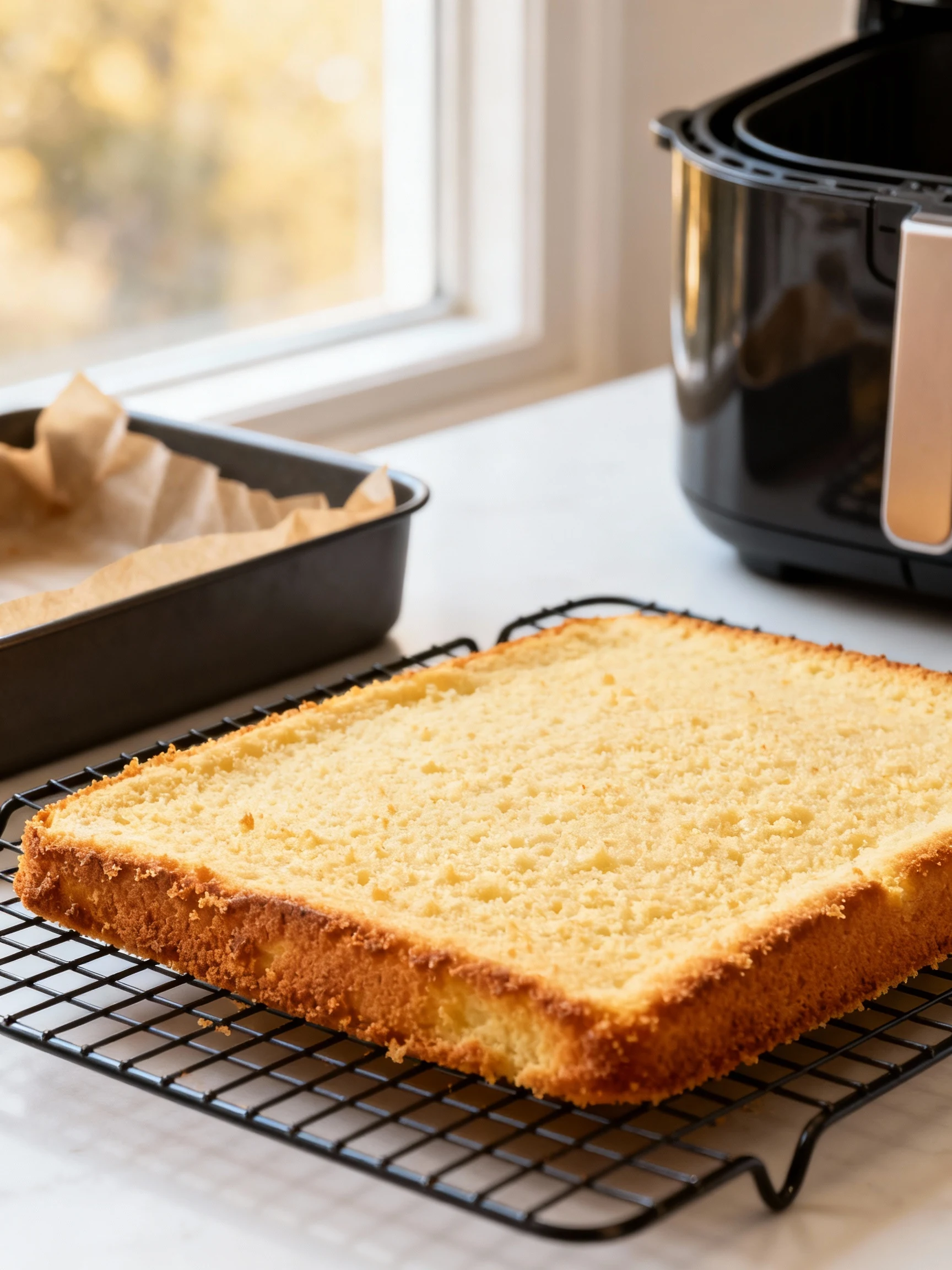 Air fryers vary like people’s opinions on pineapple pizza. Your timing might land a little earlier or later, so watch the cake closely the first time. Also, pick a pan that fits with room for air circulation, or the bake can turn uneven.