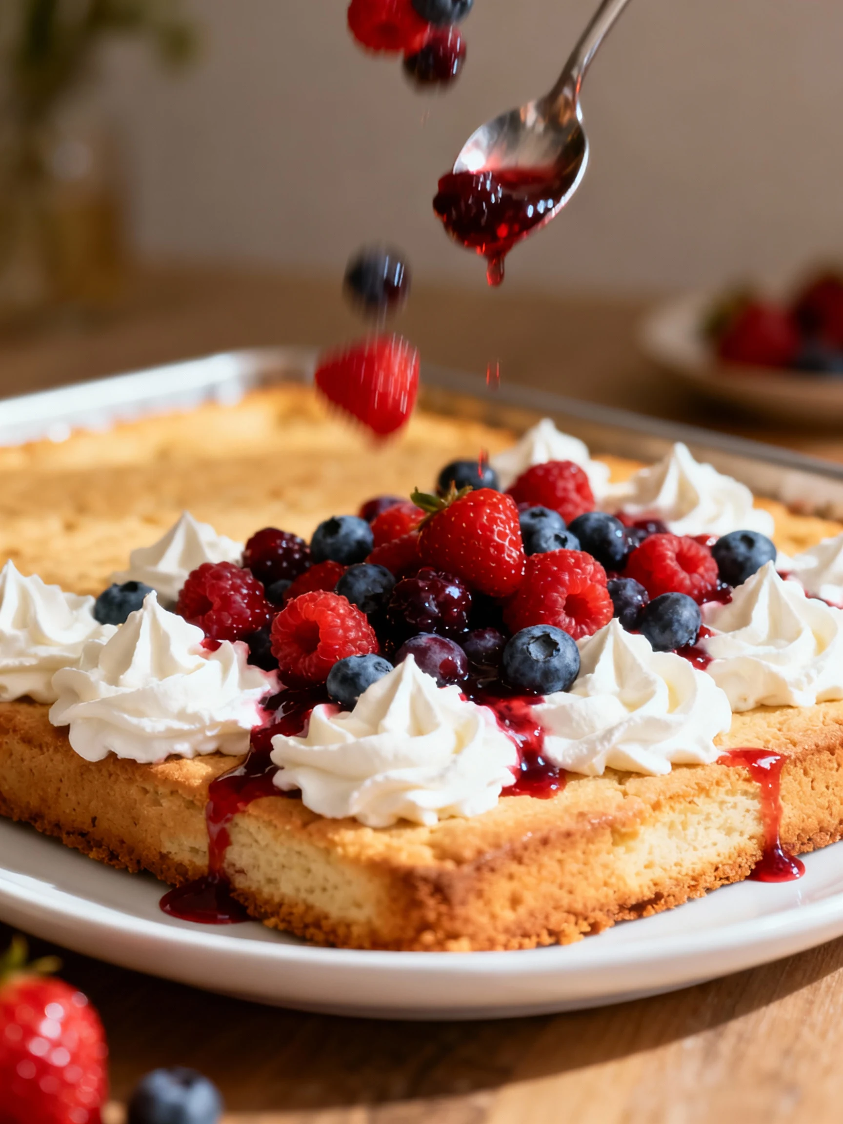Assemble sheet-pan style. Place the cooled cake on a platter. Spoon half the whipped cream over the top, then pile on berries and their juices. Add the remaining whipped cream in swoops, then finish with extra berries.
