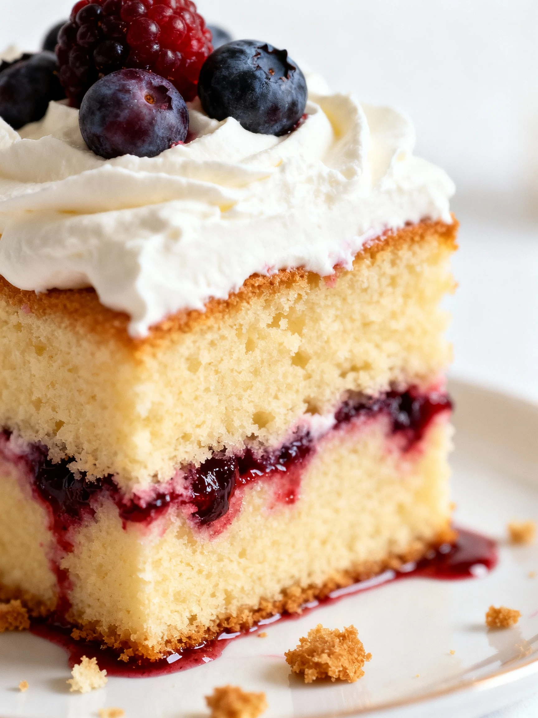 Cool completely. Let the cake cool in the pan for 10 minutes, then lift out and cool fully on a rack. If you assemble while warm, the whipped cream will melt and you’ll pretend you meant to make “berry soup cake.”