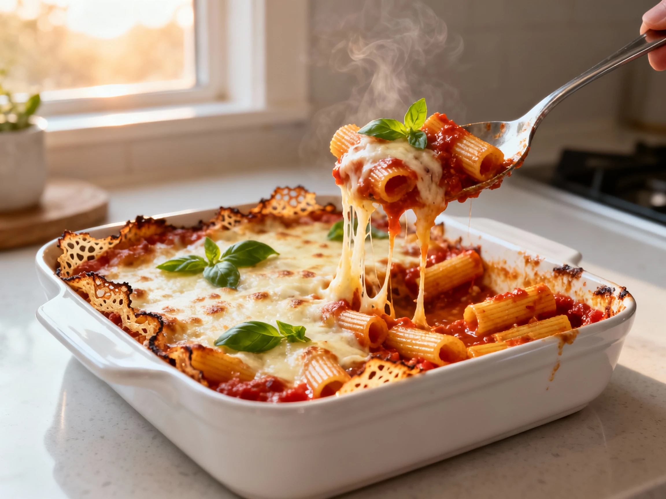 Short, tube-y pasta wins: ziti, penne, rigatoni, or casarecce. They hold sauce inside and don’t collapse. Avoid long strands like spaghetti—they tangle and bake unevenly.