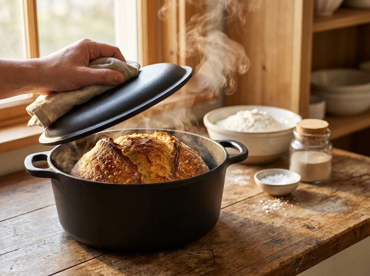 - Bake with steam: Carefully transfer the dough into the preheated Dutch oven (on parchment for easy handling). Cover and bake 25 minutes. Then uncover and bake 18–22 minutes until deep golden-brown, crackly, and internal temp hits 205–210°F.