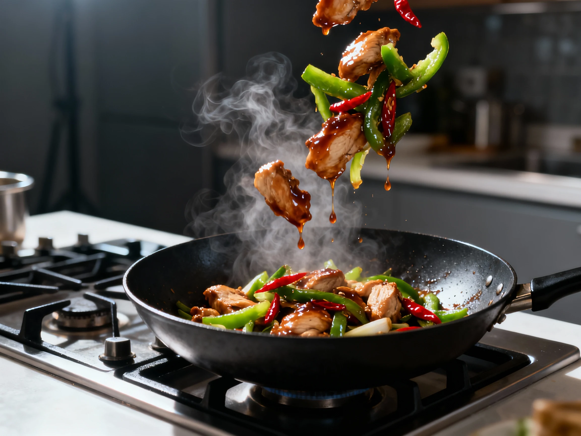 Gloss comes from cornstarch plus a full boil. “Wok hei” needs fierce heat, dry ingredients, and movement. Preheat until ripping hot, avoid overcrowding, and let food contact the metal long enough to sear before you stir. Home burners won’t match restaurant BTUs, but you can get close. FYI, carbon-steel pans help.