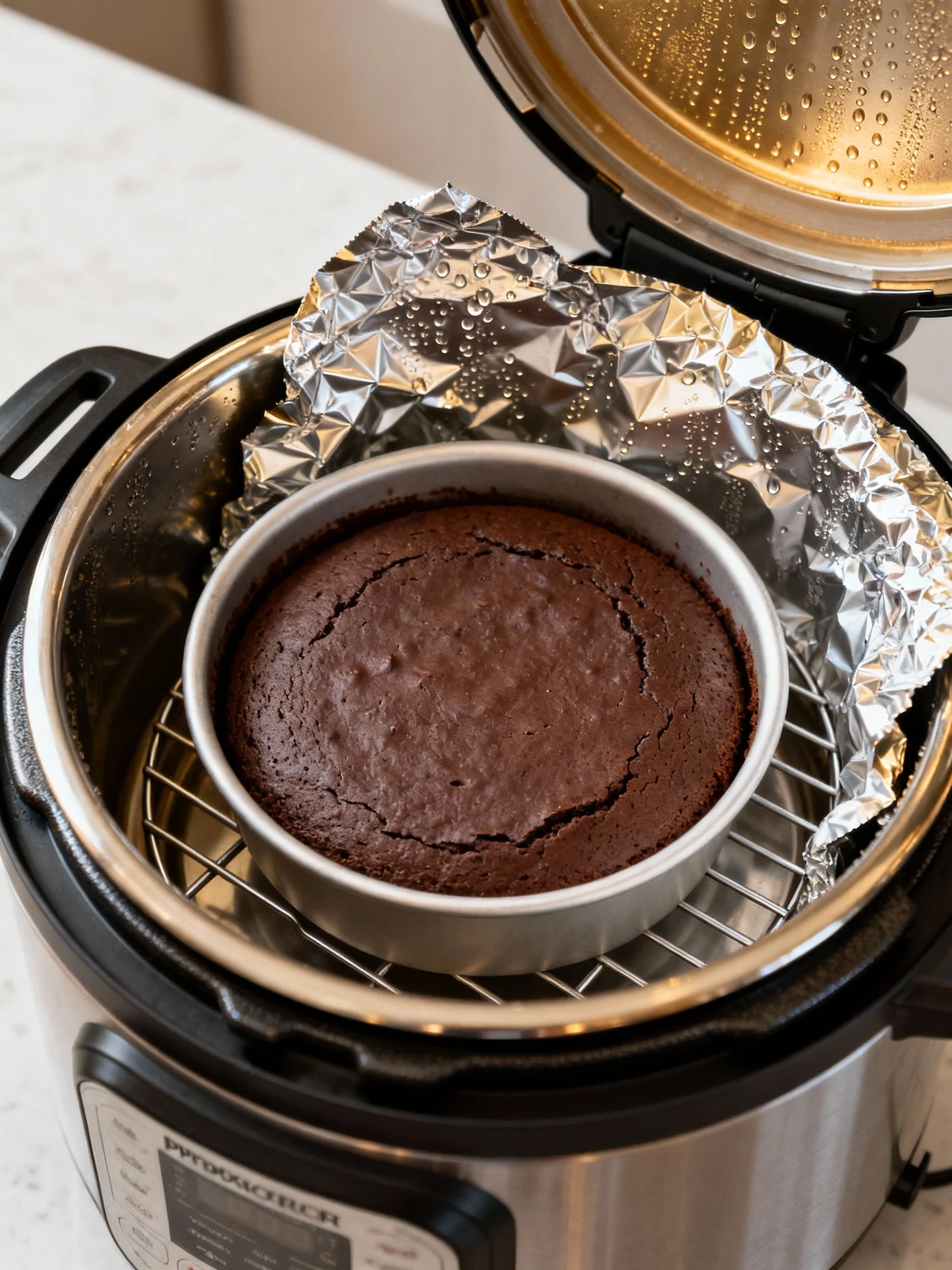 Skipping the foil cover. The Instant Pot creates condensation, and without foil your cake can end up with a soggy top. A tight foil seal fixes that instantly.