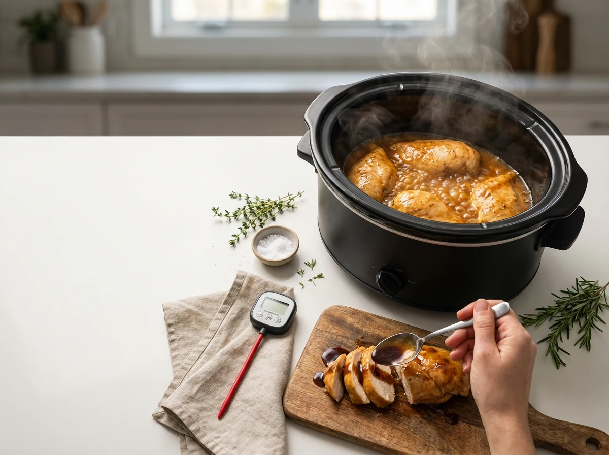 Chicken breast cooks fast and dries out faster. The fix isn’t complicated, but it’s non-negotiable. Even thickness, low heat, and a flavor-rich bath keep it succulent every time. Pound thicker ends so each piece reaches temp together, then let the slow cooker do what it does best: steady, gentle heat.