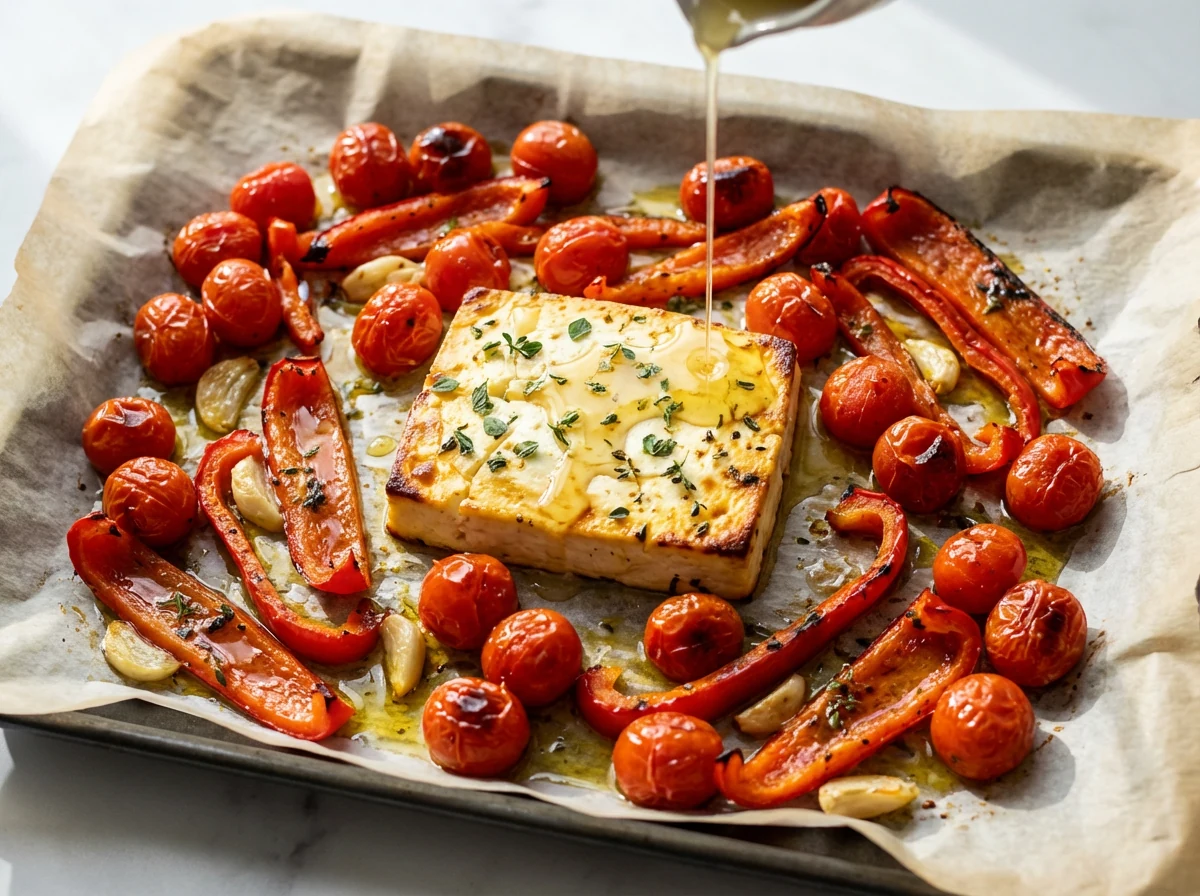 Roast, then contrast: Heat caramelizes sweet tomatoes and peppers while softening feta to a custardy center with a lightly browned exterior. Then lemon, herbs, and a touch of honey land for acid, freshness, and balance. Sweet + salty + creamy + crunchy = done.