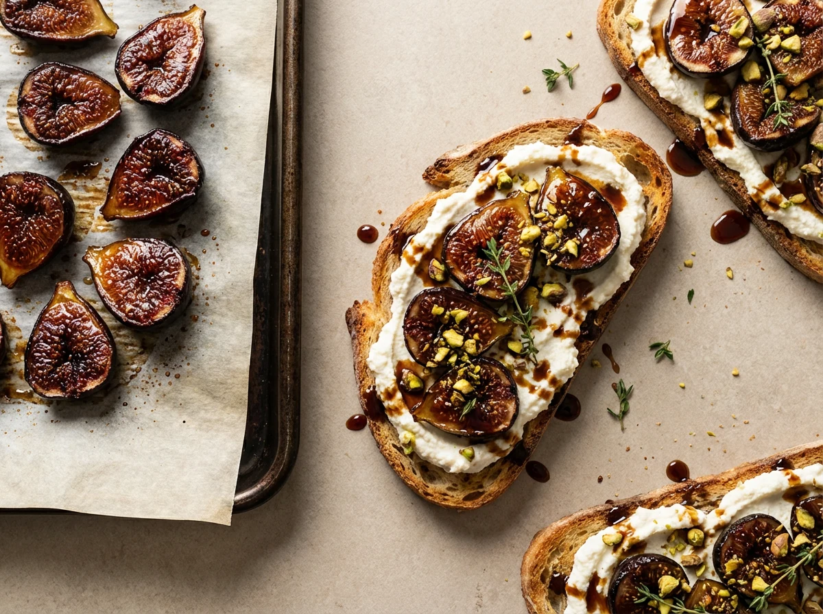 - Assemble. Spread a generous swoop of whipped ricotta on warm toast. Top with roasted figs, then scatter pistachios and thyme.