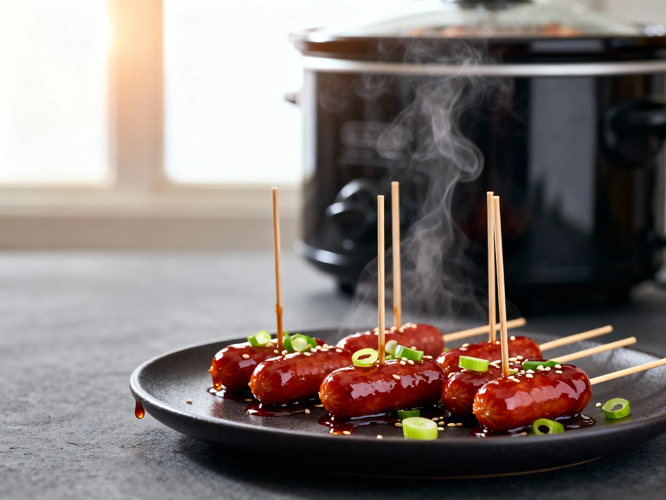 2. Overhead shot of Honey Garlic Little Smokies in a slow cooker set to Warm, mahogany glaze pooling and clinging, sprin