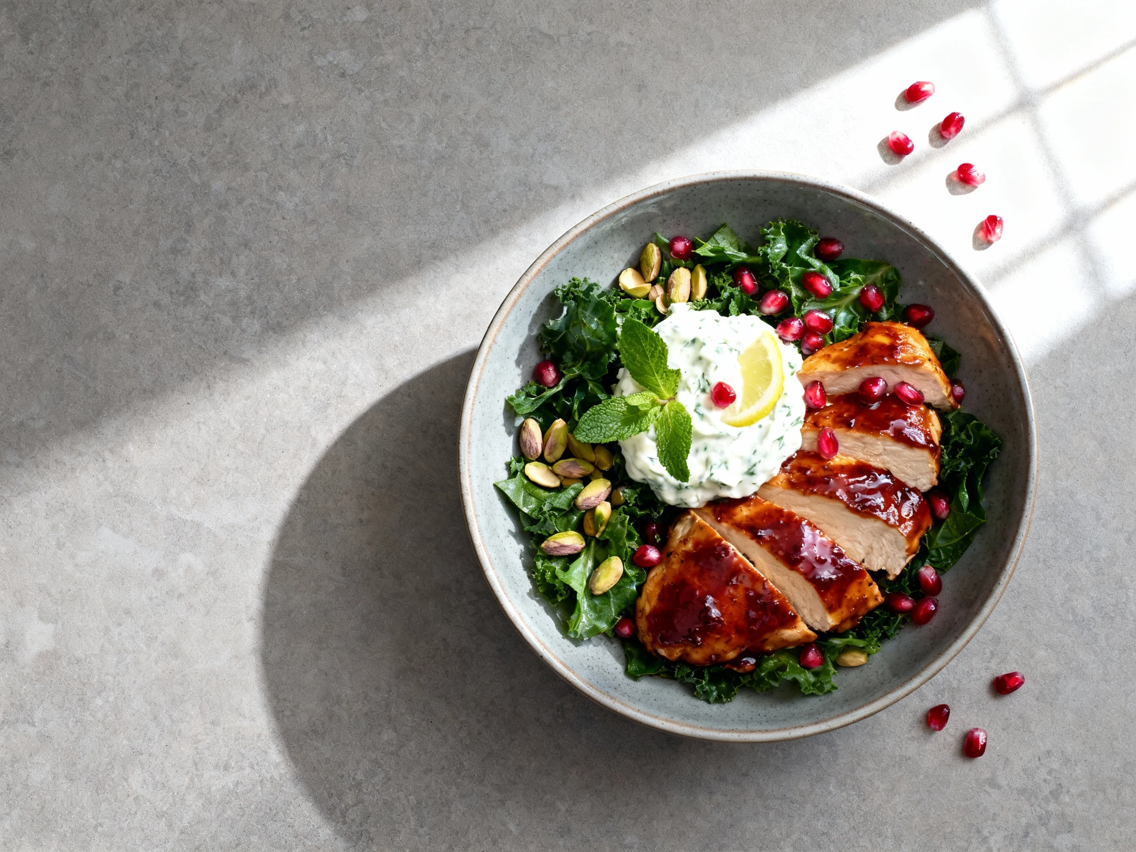 - Restaurant-level contrast in 30 minutes: Juicy chicken, cool herby yogurt, and shatter-crisp salad with sweet-tart arils.