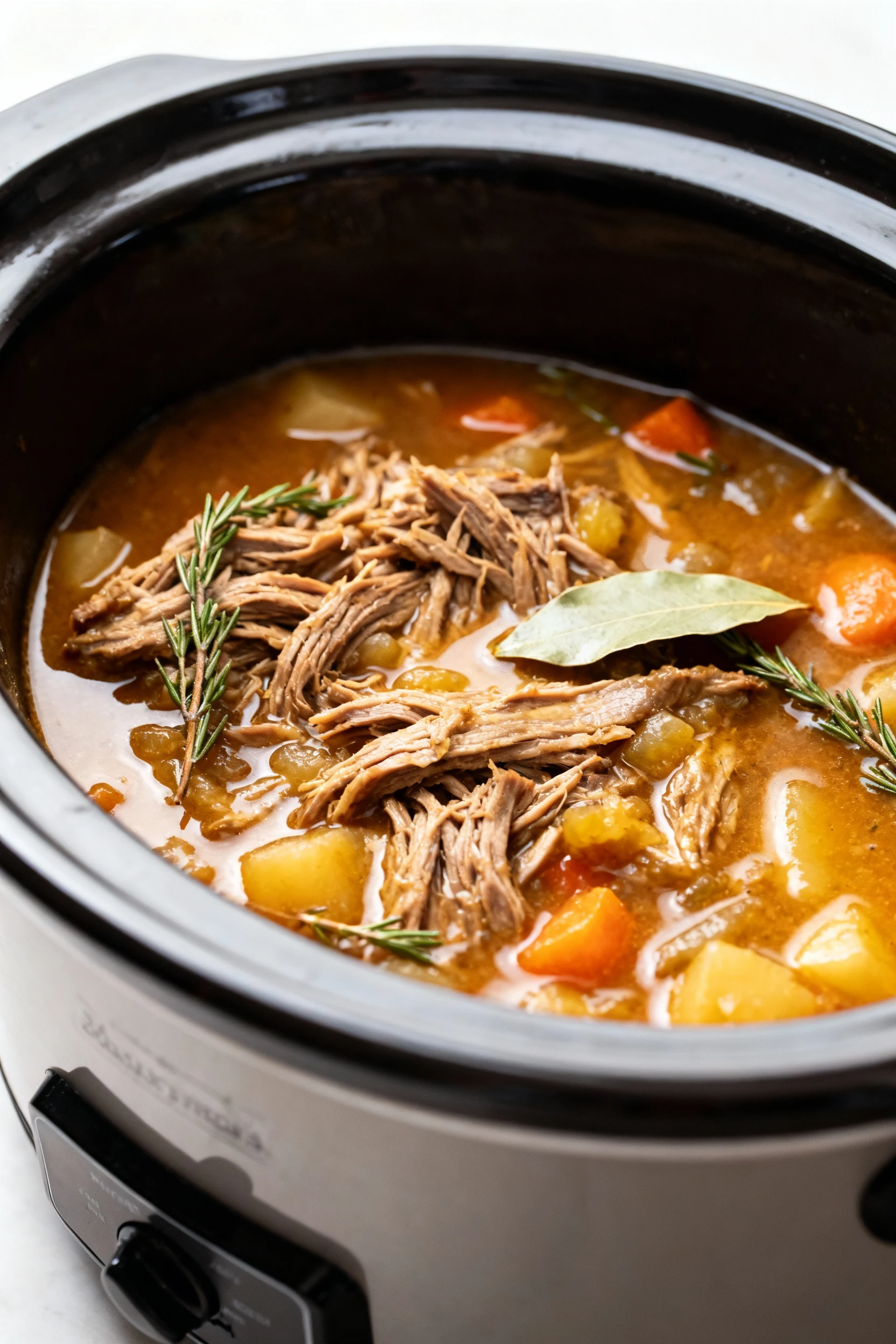 Morning prep, evening victory. Low heat over hours melts collagen and turns your roast into a shreddable feast. Add potatoes halfway so they don’t go mushy.