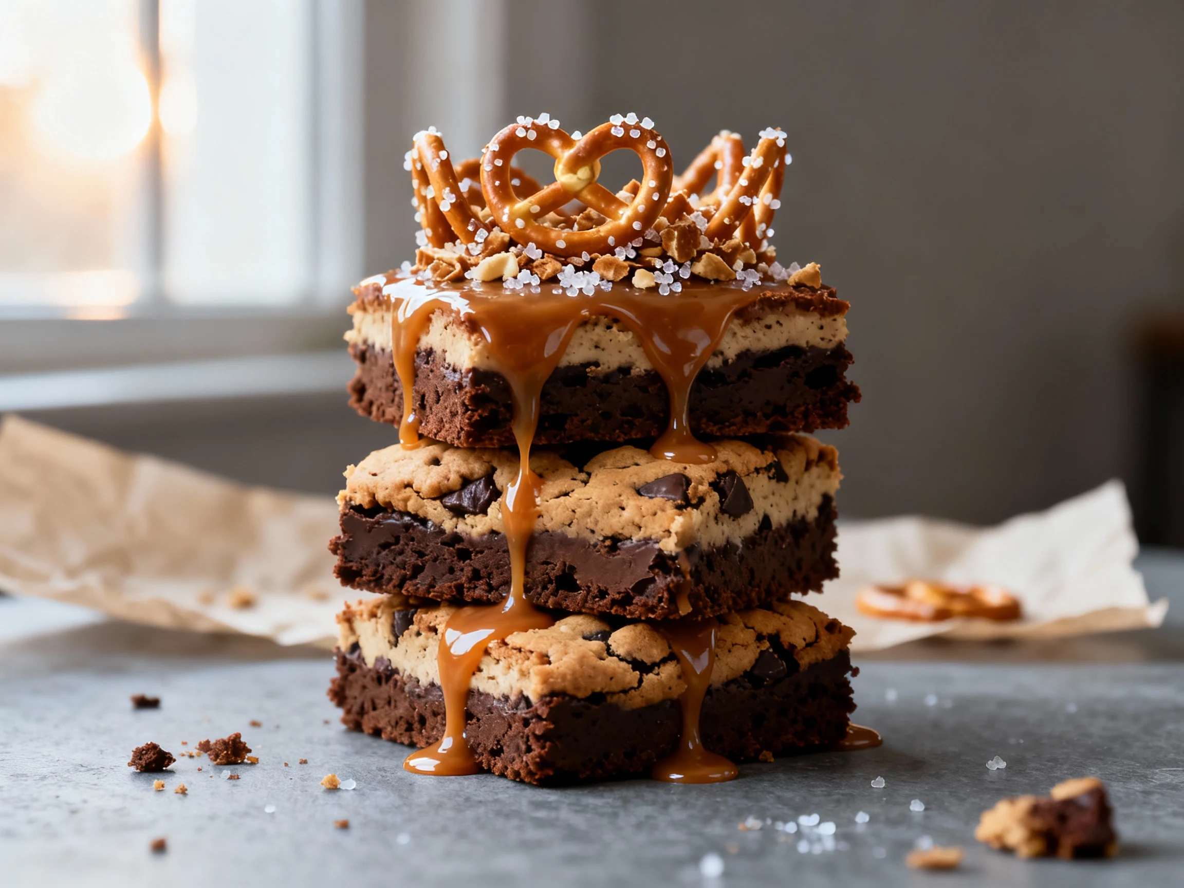 The win comes from contrast and structure. A dense, ultra-moist brownie base anchors everything so the caramel doesn’t vanish into the abyss. A slightly thicker chocolate chip cookie dough layer adds chew and lift, creating bite-by-bite variety. Then we lace warm, pourable caramel through the layers and crown it with pretzel crunch and a hit of flaky sea salt for that pop. The final trick? Tenting with foil late in the bake so the cookie tops don’t over-brown before the center sets.