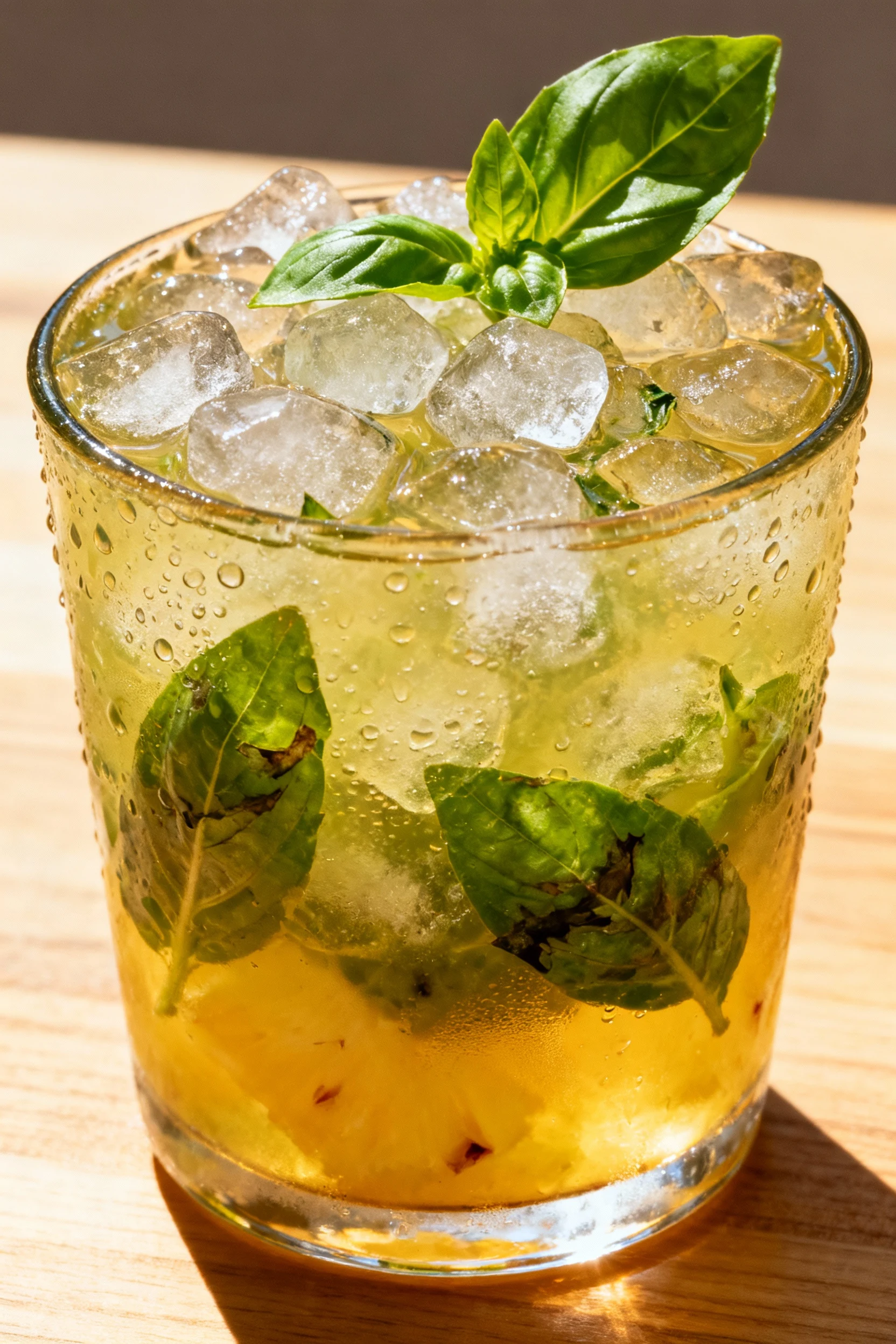 • Tropical Basil Cooler: 3/4 oz simple syrup (plain or vanilla), 1–2 oz pineapple juice, 1/2 oz lime juice, 4 oz club soda, ice, basil sprig.