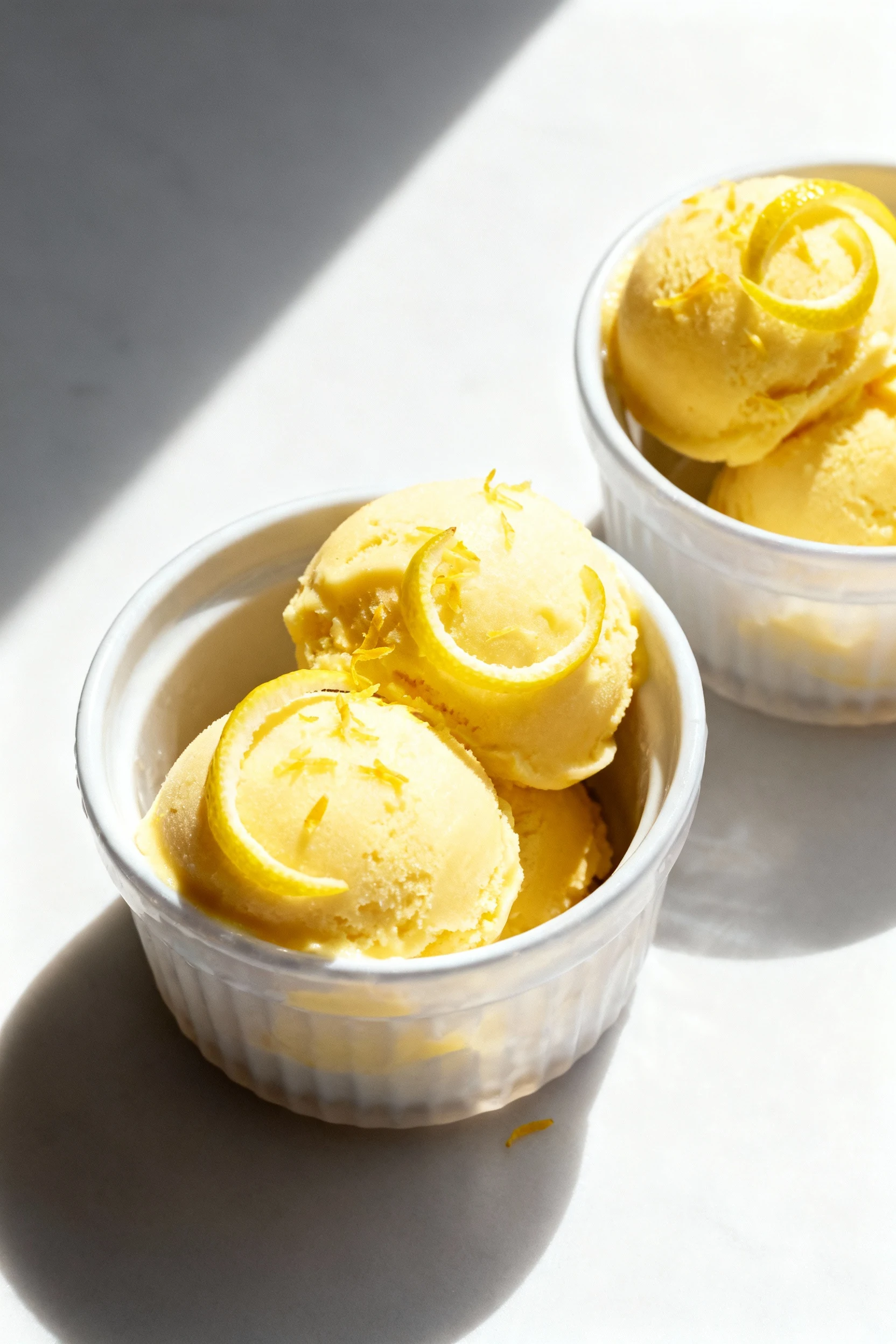 Close-up of Lemon Zing sorbet scoop with glossy micro-crystal texture and flecks of zest, shallow depth of field, natura
