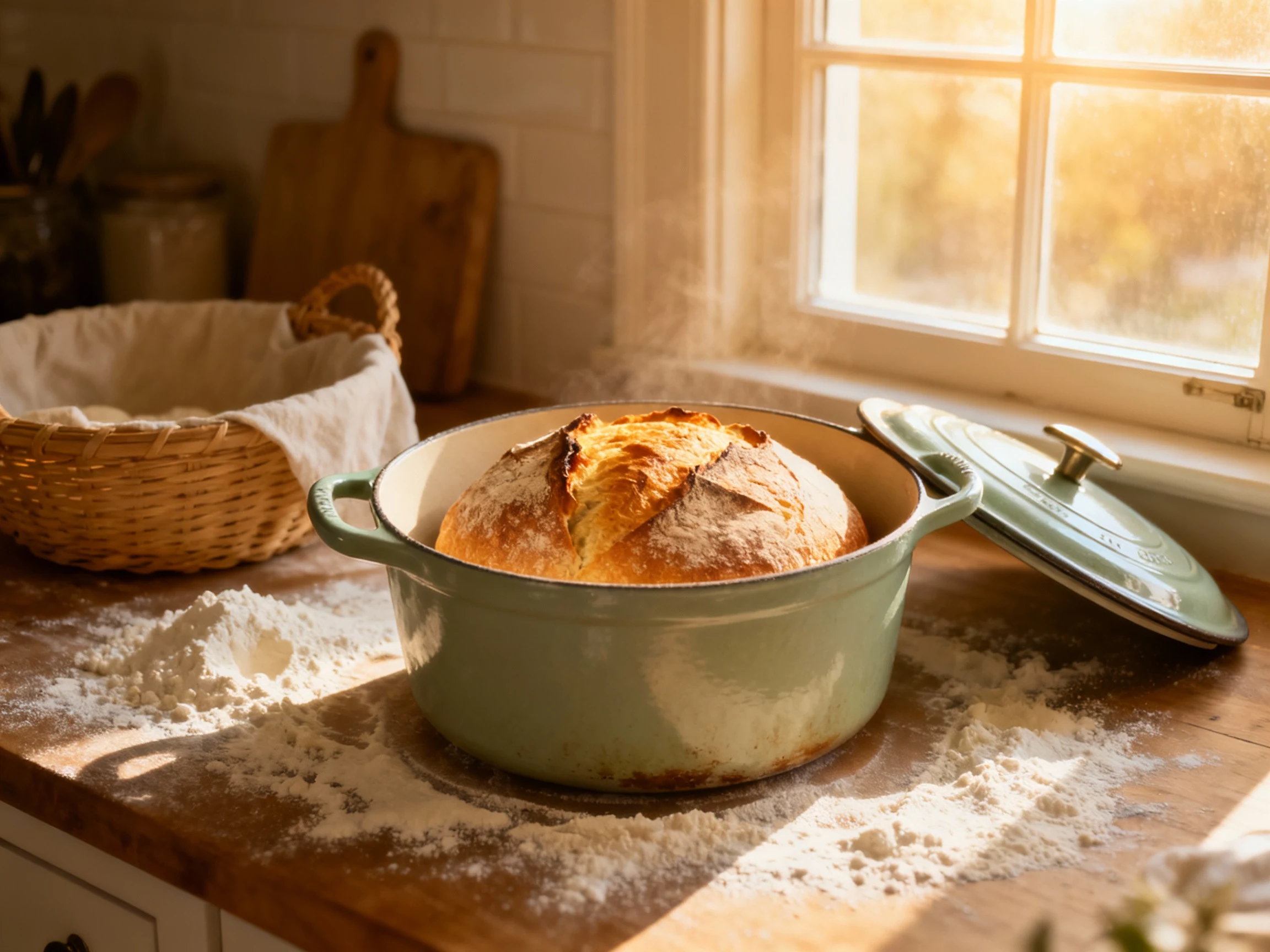 7. Score and bake: Slash the top, pop it into the preheated pot, bake 20 minutes covered, then 20–25 minutes uncovered.