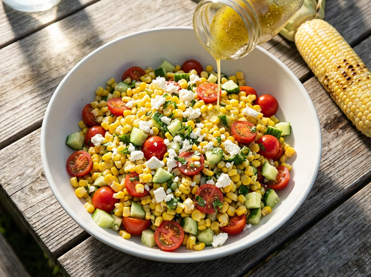 A zesty 15-minute summer side bursting with juicy tomatoes, crisp cucumber, sweet corn, and tangy feta—perfect for cookouts.